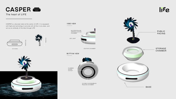 Casper, the discreet robot at the heart of the L.I.F.E. system, acts like the lake’s antibody—moving through four key stages: detection, balance, neutralization, and collection of Harmful Algal Blooms (HABs).